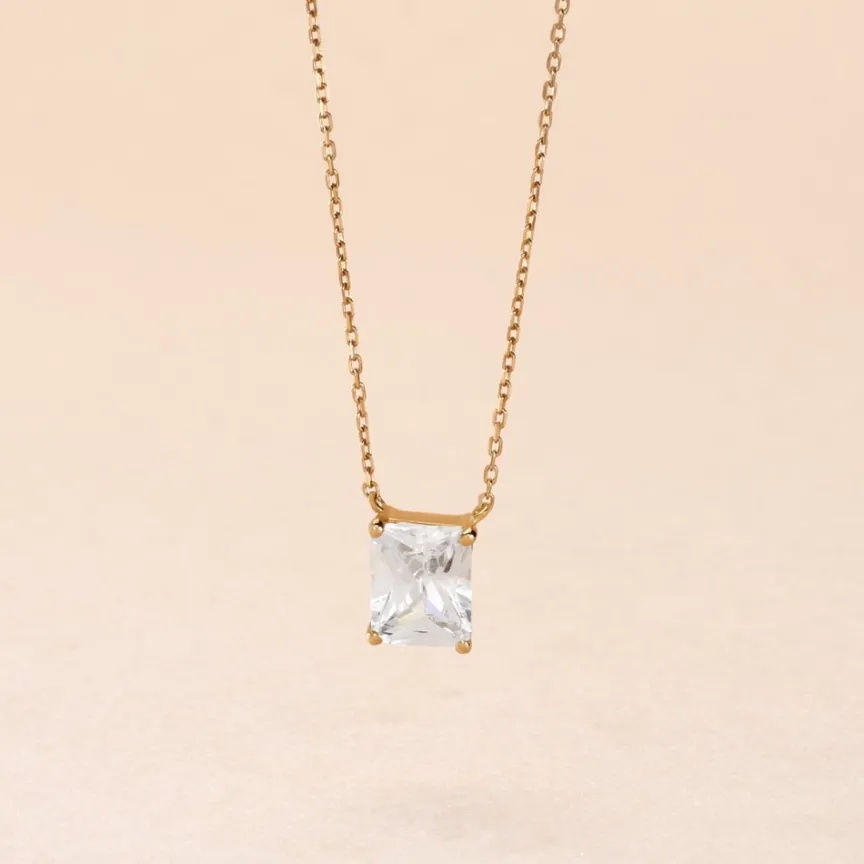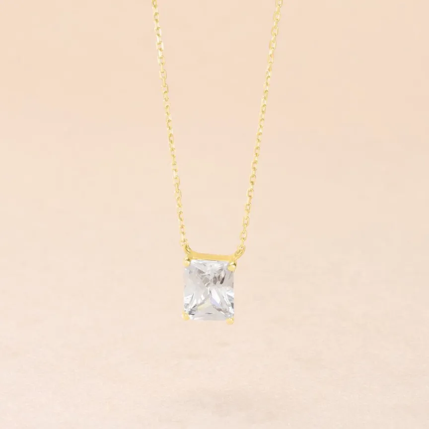 Collier Or Jaune 375/1000 Rectangle Oxyde De Zirconium Octogone Serti Griffes Maille Forçat 40+2cm