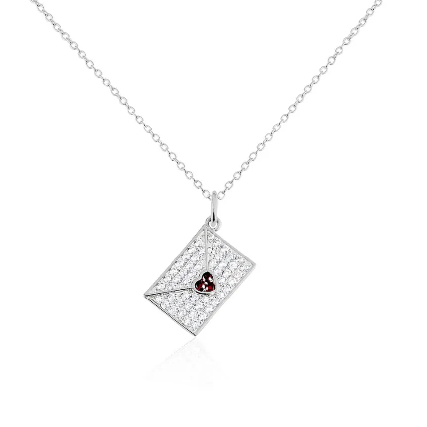 Collier Argent 925/1000 Enveloppe Coeur Rouge Maille Forçat Pavage Oxydes De Zirconium 45cm