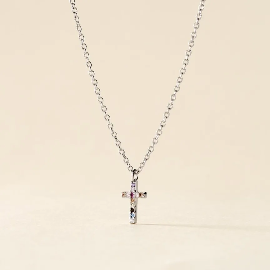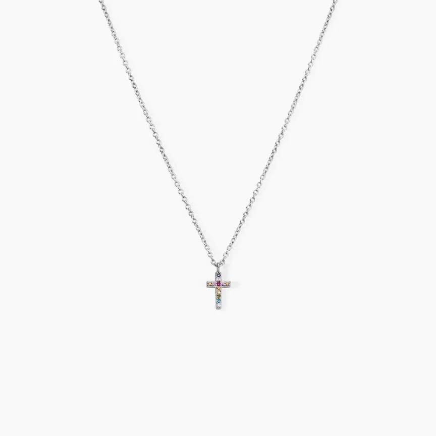 Collier Argent 925/1000 haïvy Croix Pavage Oxydes De Zirconium Multicolore Maille Forcat 42+3cm