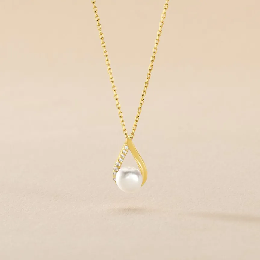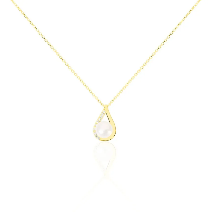 Collier Or Jaune 375/1000 Goutte Semi Pavage Oxydes De Zirconium Perle De Culture 5mm