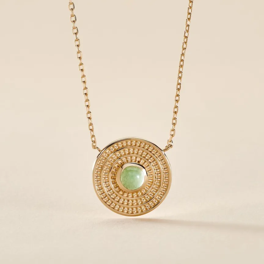 Collier Plaque Or Jaune Rond Aventurine Verte Maille Forcat 45cm