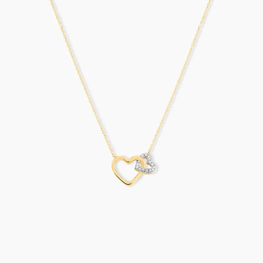 Collier Or Jaune 375/1000 Forme Double C艙ur Maille Forçat Pavage Diamants Micro Setting 42cm