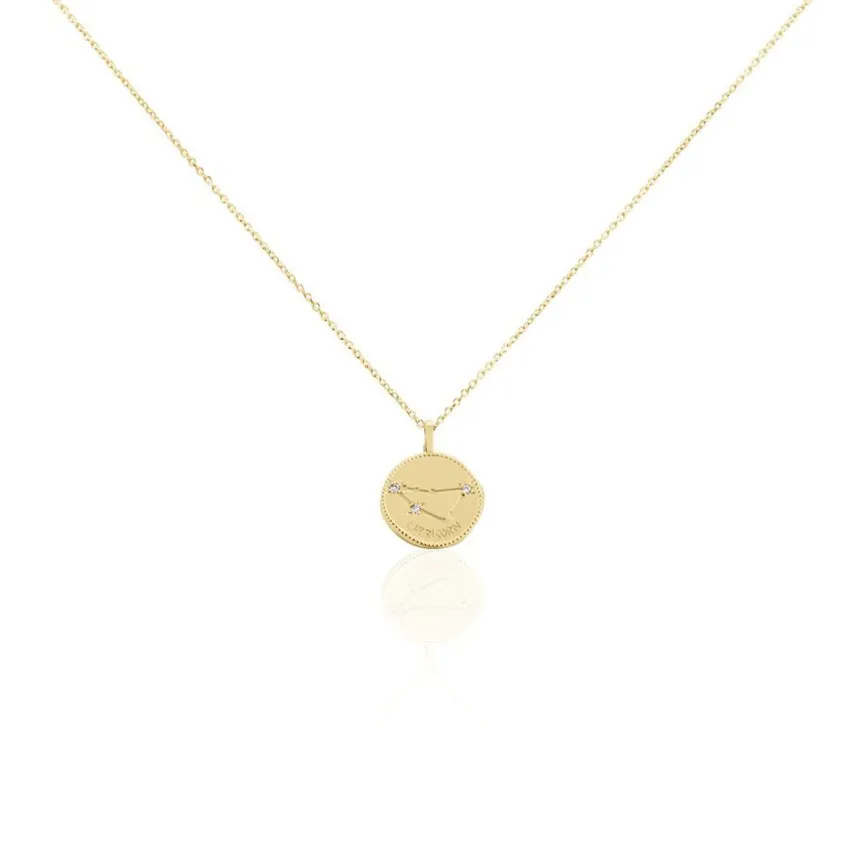 Collier Plaqué Or Jaune Pastille Mate Signe Astrologique Capricorne Oxydes De Zirconium Chaine Forcat 50cm