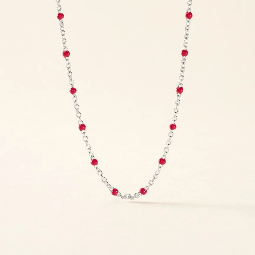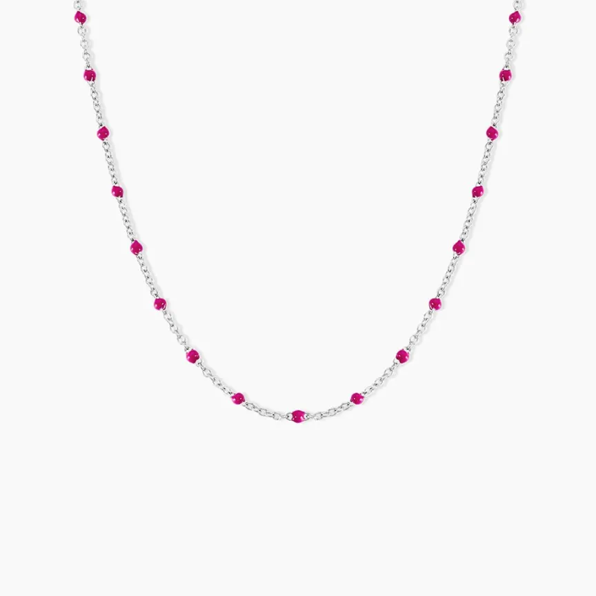 Collier Argent Blanc Email Rose 44cm