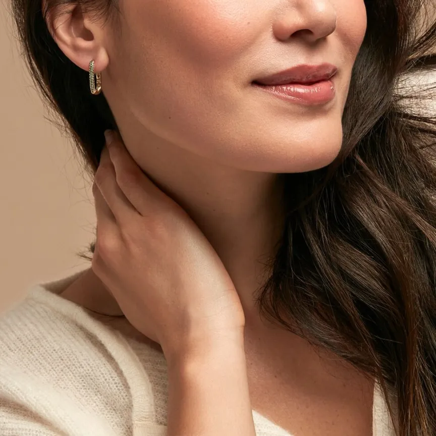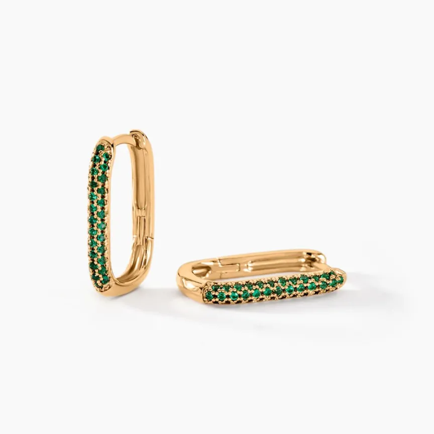 Créoles Plaque Or Rectangulaires Pavages Spinelles Synthétiques Verts Diamètre 18*13mm