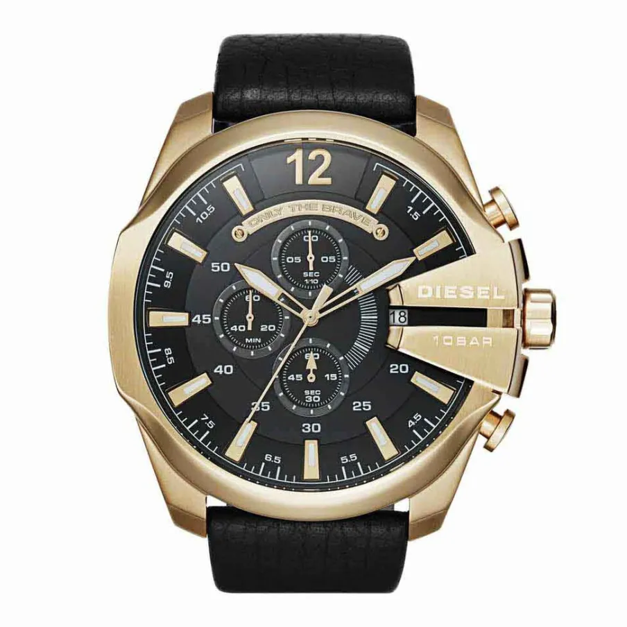 Montre Diesel Mega Chief Acier Dore Ronde Quartz Chronographe 51mm Fond Noir Bracelet Cuir Noir Dz4344