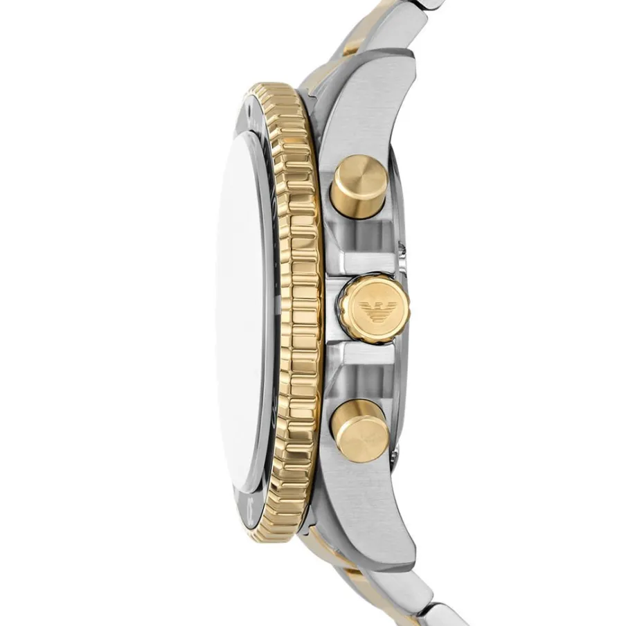 Montre Armani World Explorer Acier Bicolore Ronde Quartz Solaire Chrono 43.5mm Fond Noir Bracelet Acier Dore/blanc Ar11680
