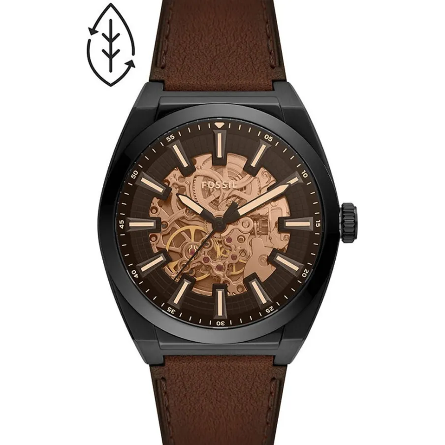 Montre Fossil Everett Acier Noir Ronde Automatique 42mm Fond Noir Bracelet Cuir Marron Me3207