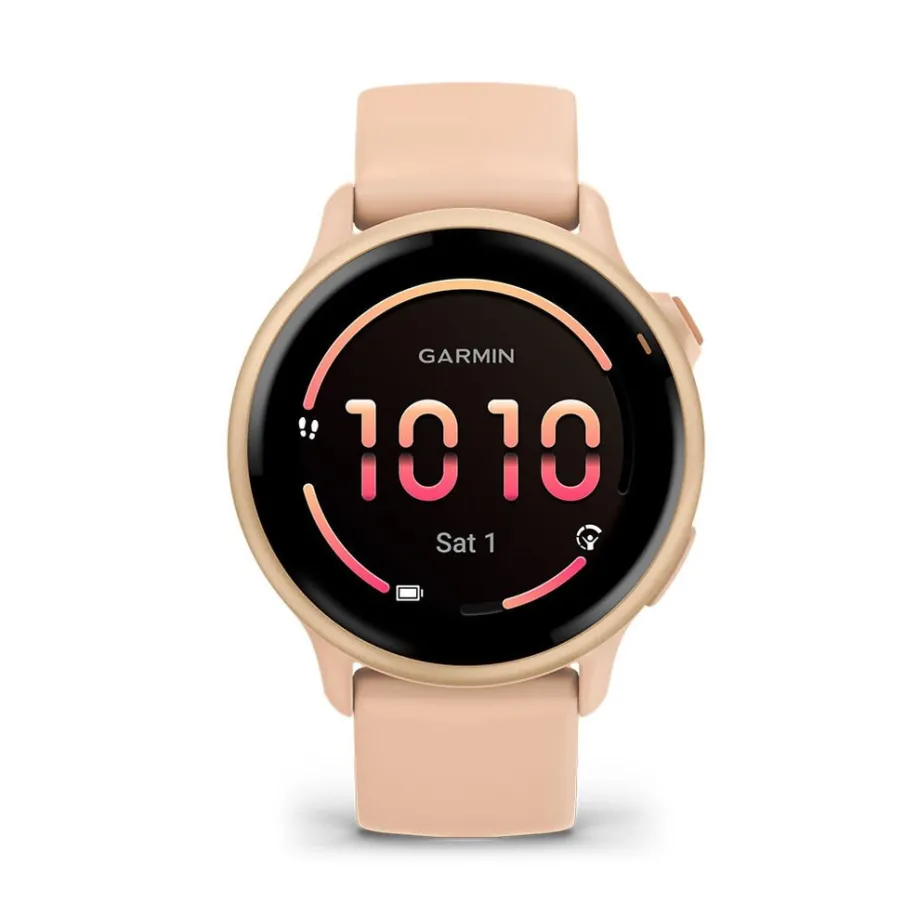 Montre Garmin Vivoactive 6 Polymere Rose Ronde Connectee Multifonctions 42mm Lunette Aluminium Dore Fond Noir Bracelet Rose Silicone 010-02985-03