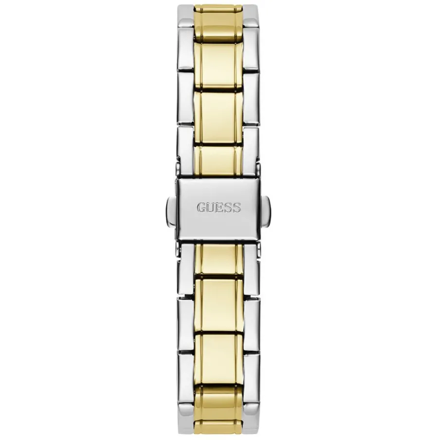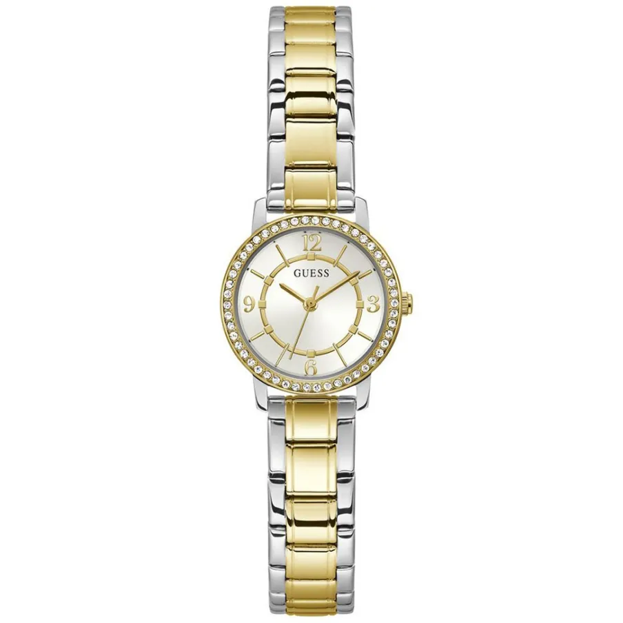 Montre Guess Melody Acier Bicolore Doré Blanc Ronde Quartz 28mm Lunette Strassée Fond Blanc Bracelet Acier Doré Gw0468l4
