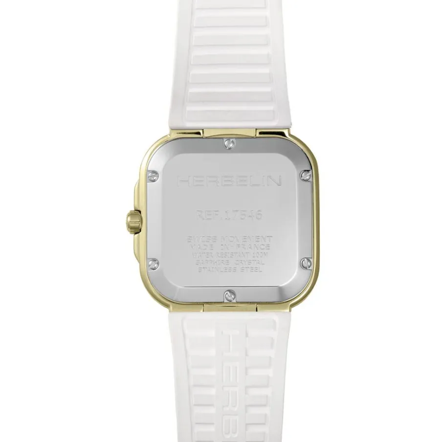 Montre Herbelin Cap Camarat Acier Inoxydable Doré Quartz Carre 30Mm Fond Nacre Blanche Index Diamants Bracelet Silicone Blanc 17546P1N89Cw