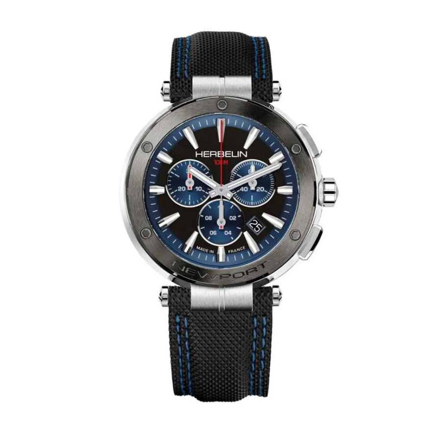 Montre Herbelin Newport Chrono Acier Blanc Ronde Quartz Chronographe 43mm Fond Bicolore Lunette Pvd Noire Bracelet Cuir Noir 37688ag65