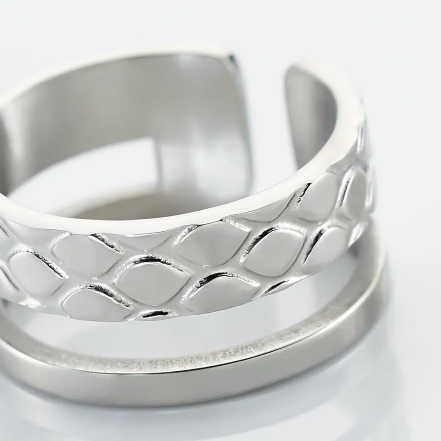 Bague Ajustable Acier Blanc 2 Anneaux Larges Ajoures Lisse Et Reptile