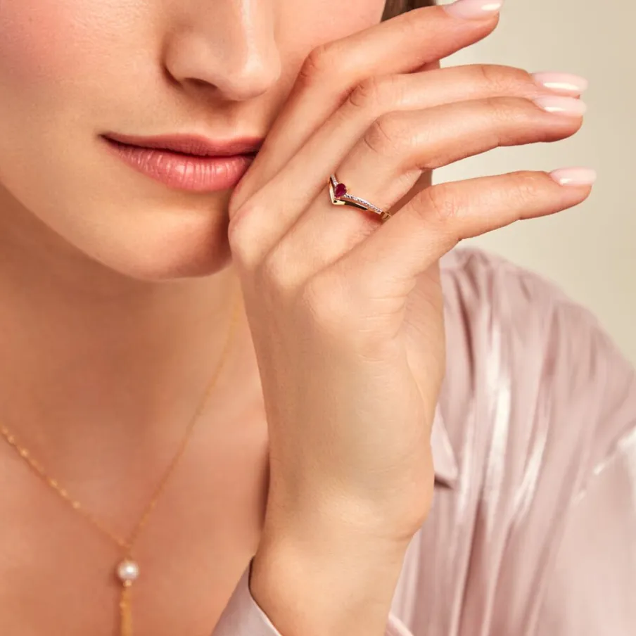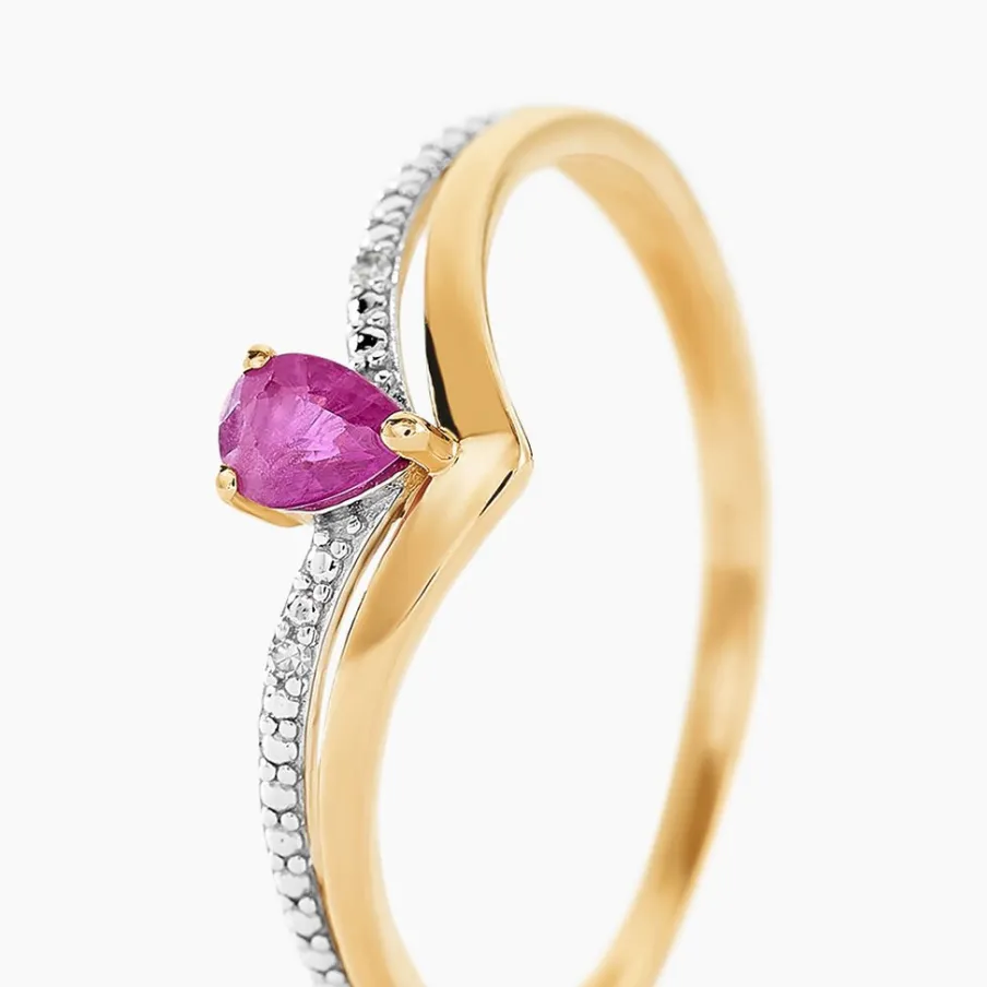 Bague Solitaire Accompagne Or Jaune 375/1000 Aile De Mouette Poire Rubis 0.18cts Accompagne Pavage Diamants