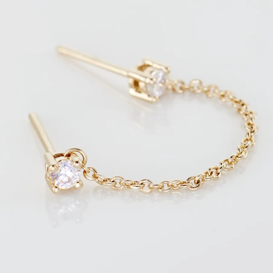 Bijoux D’oreille Unitaire Plaque Or Jaune 2 Oxydes De Zirconium Sertis Griffes Et Chaine