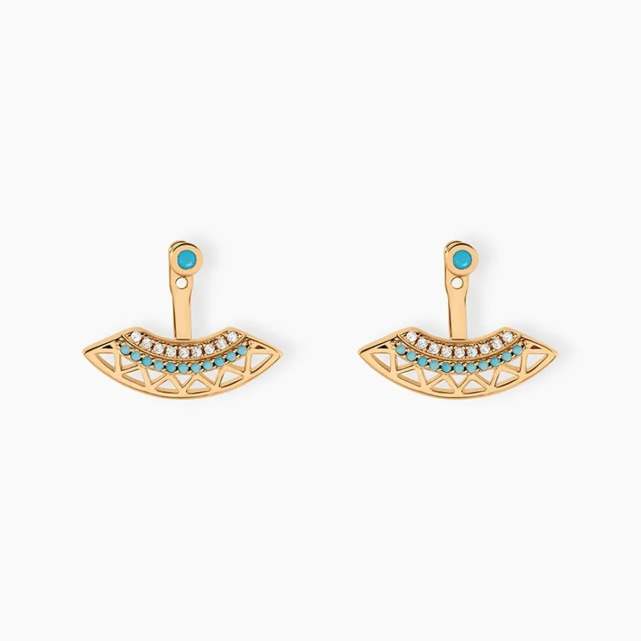 Bijoux D’oreilles Plaqué Or Jaune Motifs Mexicains Ajoures Oxydes De Zirconium Et Pierres Bleues