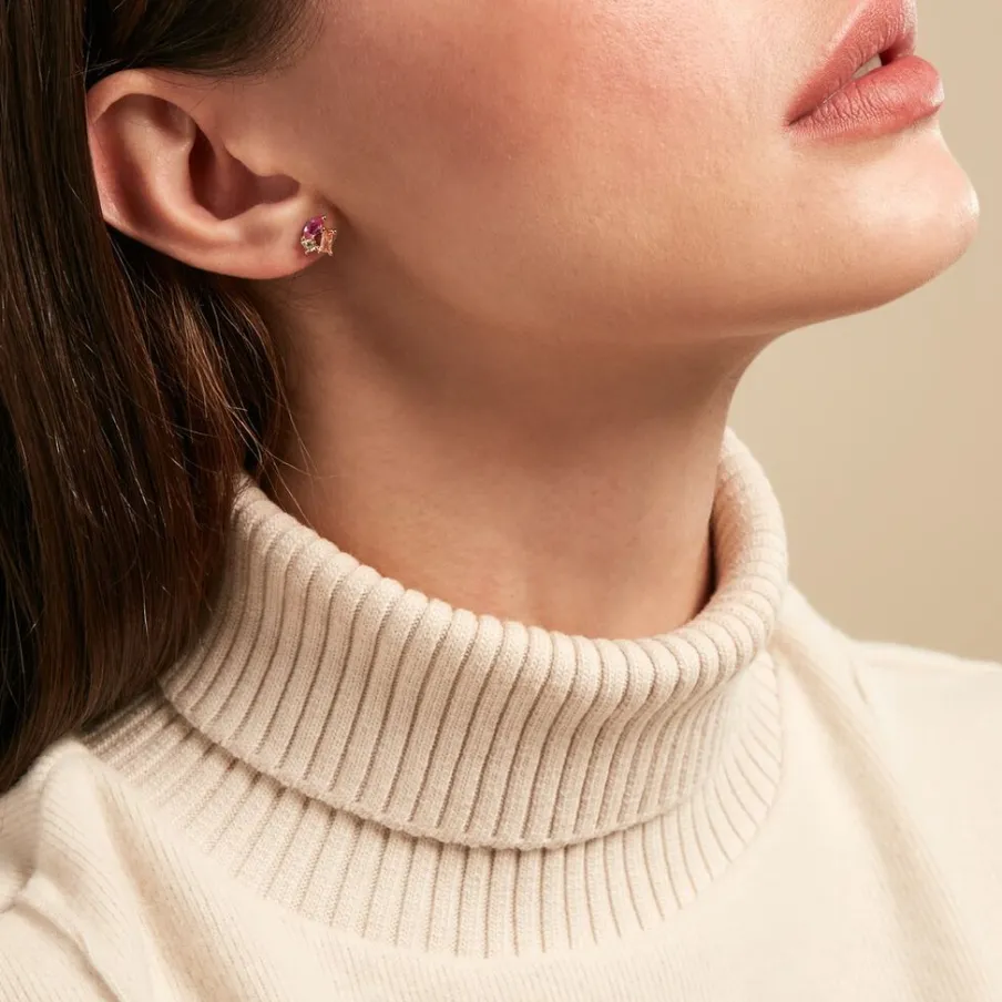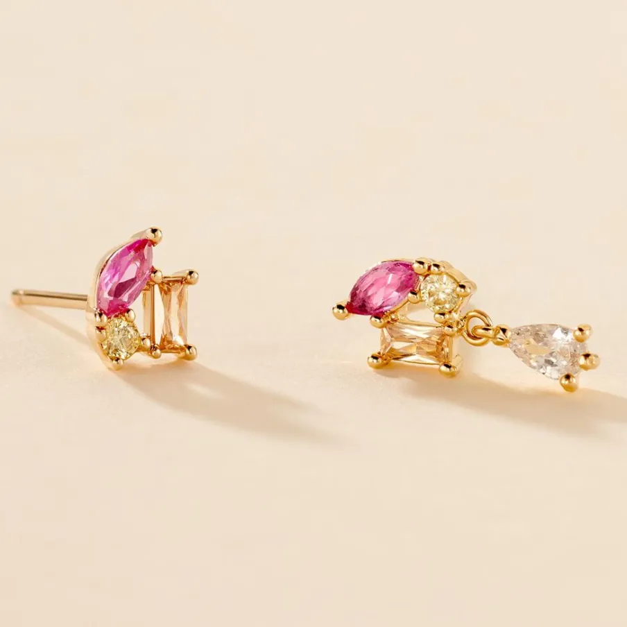 Boucles D’oreilles Pendantes Plaqué Or Jaune Asymetriques Jardins De Pierres Spinelles Fuschia Et Oxydes De Zirconium Multicolores