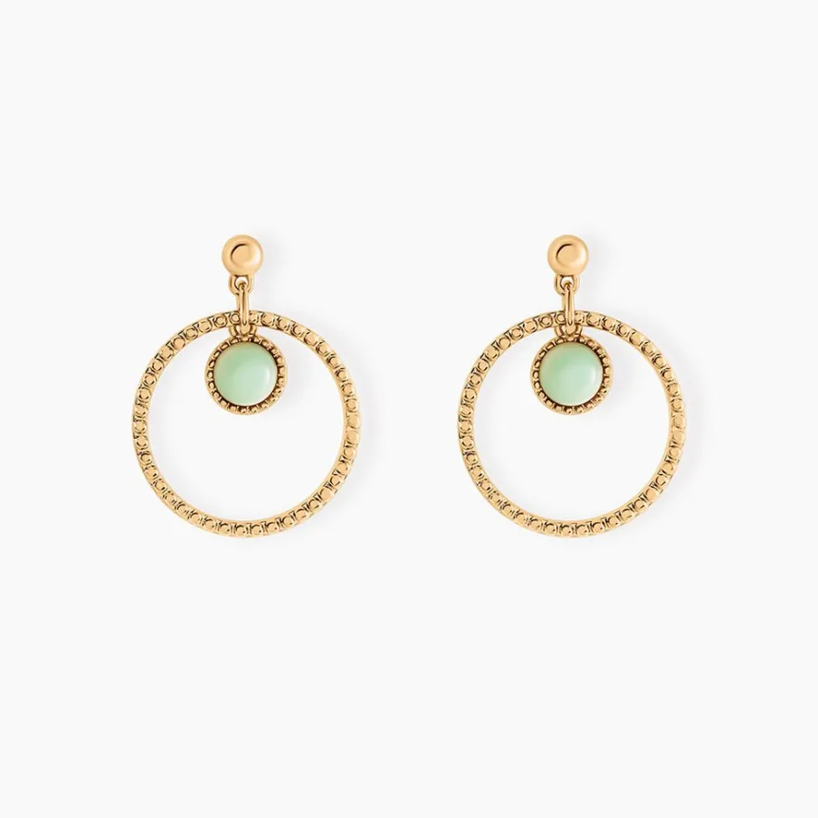 Boucles D’oreilles Pendantes Plaqué Or Cercles Effet Perlé Aventurines Rondes