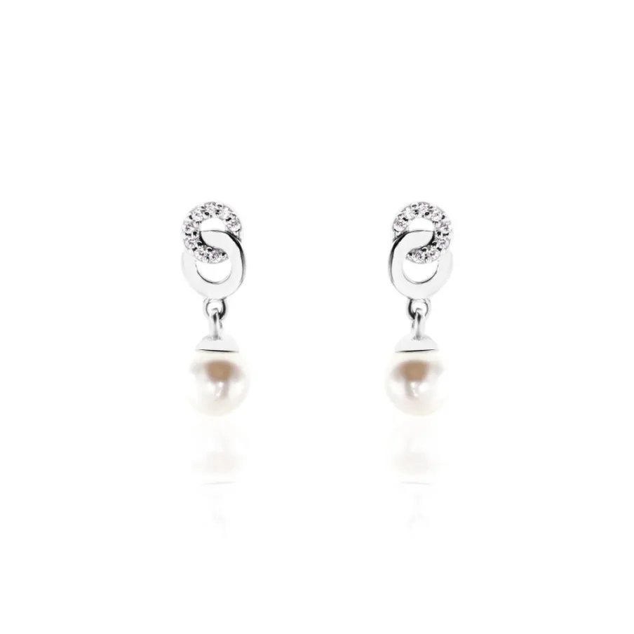 Boucles D’oreilles Argent 925/1000 2 Anneaux Entrelaces Oxydes De Zirconium Et Perle De Culture 5.5mm