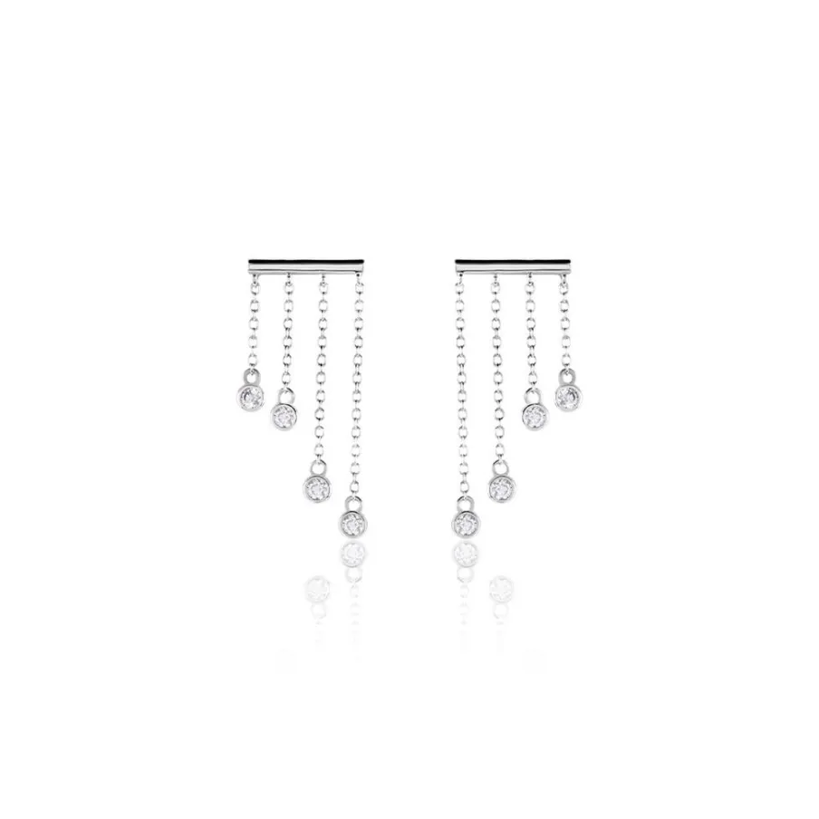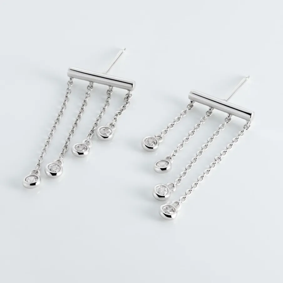 Boucles D’oreilles Pendantes Argent Blanc 925/1000 Barre Multichaines Oxydes De Zirconium Serti Clos