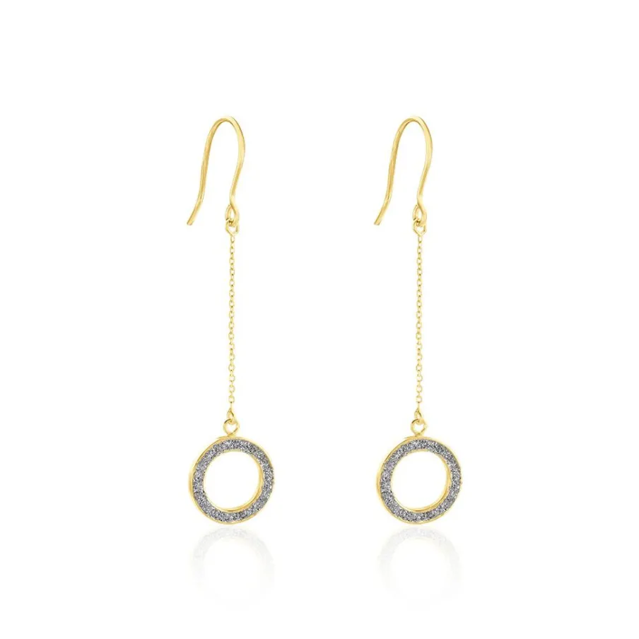 Boucles D’oreilles Pendantes Or Jaune 375/1000 Cercles Ajoures Glitter Argente Chaine Maille Jaseron