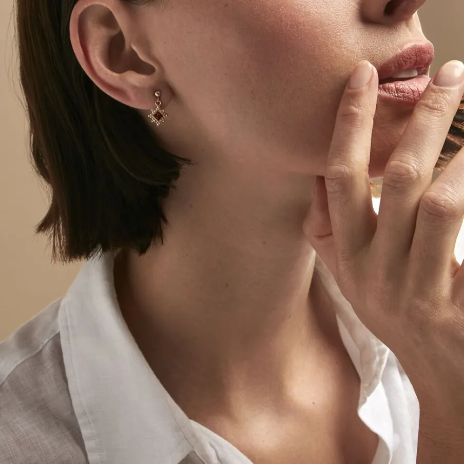 Boucles D’oreilles Pendantes Plaqué Or Jaune Losanges Oxydes De Zirconium Rouges Entourages Perlés