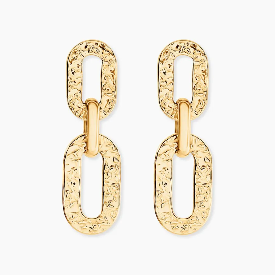 Boucles D’Oreilles Pendantes Or Jaune 375/1000 Maillons Rectangles Effet Martele