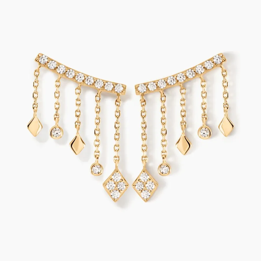 Boucles D’oreilles Pendantes Or Jaune 375/1000 5 Chaines Forcat Sur Barre Pavage Oxydes De Zirconium