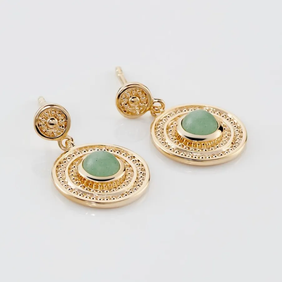 Boucles D’oreilles Pendantes Plaque Or Jaune Rondes Aventurines Vertes