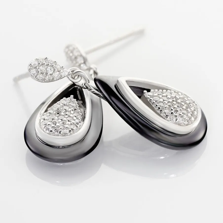 Boucles D’oreilles Argent Blanc 925/1000 Formes Gouttes Ceramique Noire Et Oxydes De Zirconium
