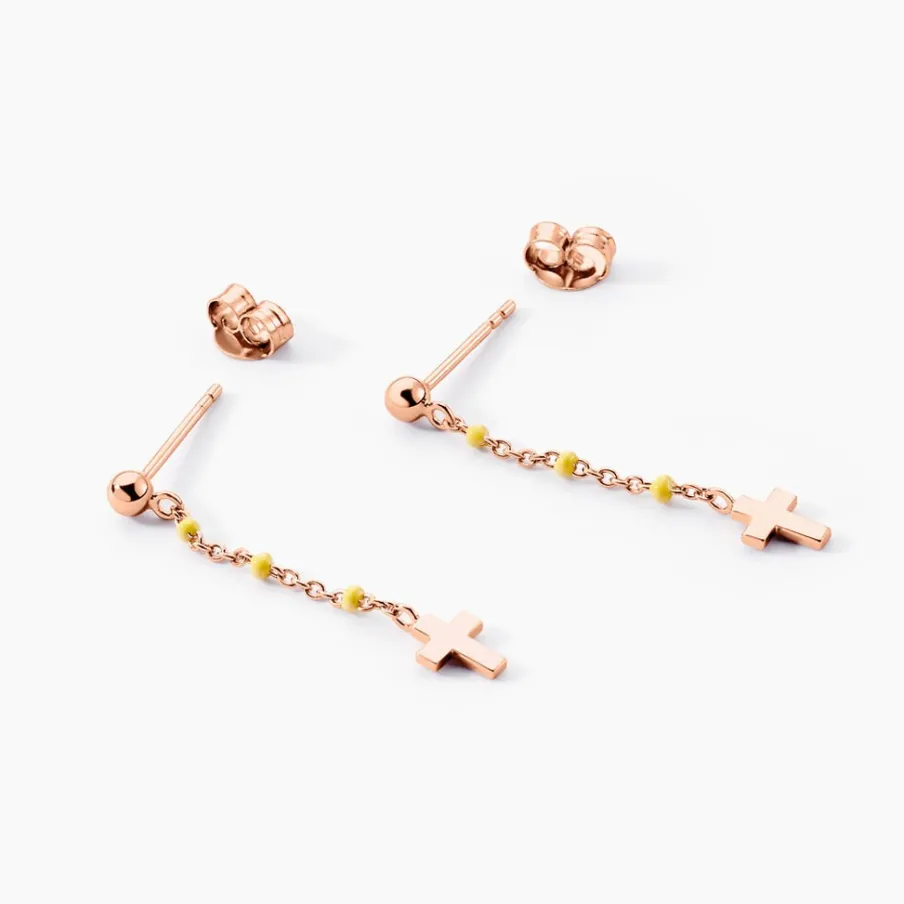 Boucles D’oreilles Pendantes Argent Rose 925/1000 Croix Boules émail Jaune Chaîne Jaseron 2cm