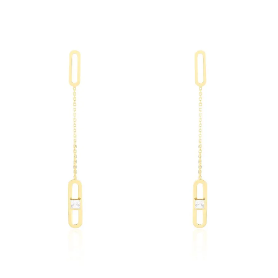 Boucles D’oreilles Pendantes Or Jaune 375/1000 Rectangle Oxyde De Zirconium Blanc Serti Clos