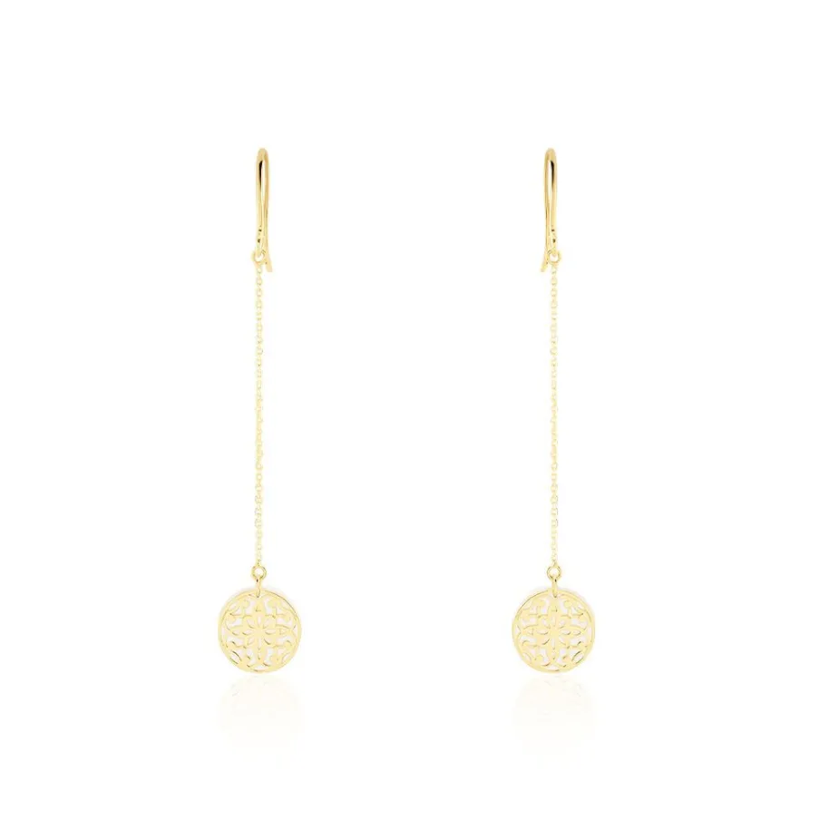 Boucles D’oreilles Pendantes Or Jaune 375/1000 Motif Rosace Et Nacre Maille Jaseron