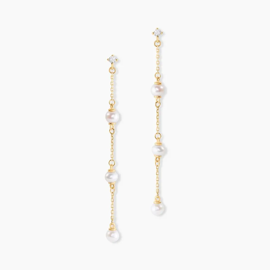 Boucles D’oreilles Pendantes Chaine Or Jaune 375/1000 3 Perles De Culture Nacre Blanche Accompagne Oxyde