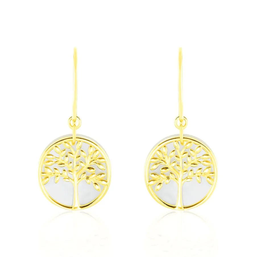 Boucles D’oreilles Or Jaune 375/1000 Fond Nacre Motif Arbre De Vie