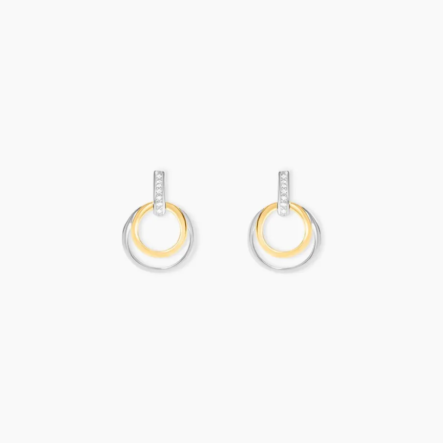 Boucles D’oreilles Pendantes Or 375/1000 Bicolore Blanc Et Jaune Doubles Cercles Ajoures Et Barrettes Pavage Diamants