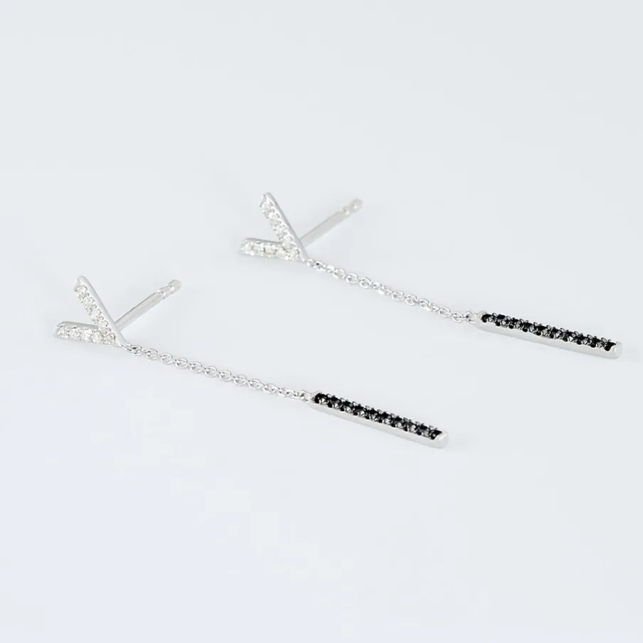 Boucles D’oreilles Or Blanc 375/1000 Formes V Pendantes Diamants Noirs Et Diamants Blancs