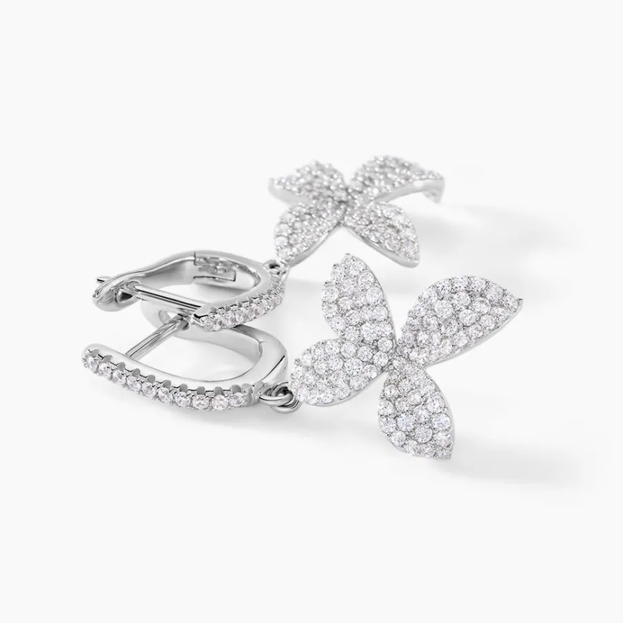Boucles D’oreilles Pendantes Argent Blanc 925/1000 Fleurs Pavage Oxydes De Zirconium