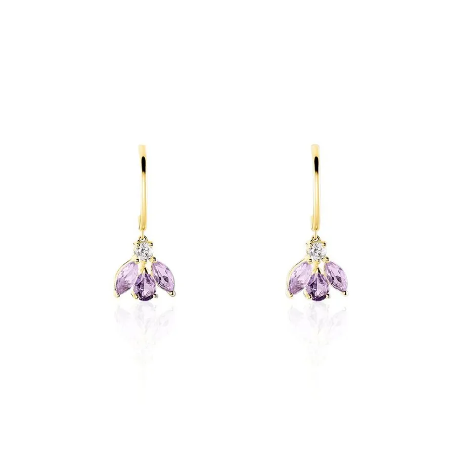 Boucles D’oreilles Pendantes Or Jaune 375/1000 Motif Pétale Améthyste Serti Griffes