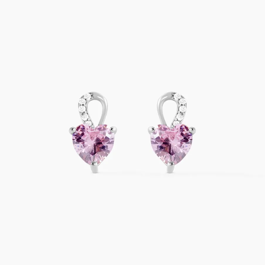 Boucles D’oreilles Puces Argent Blanc 925/1000 Coeur Rose Serti Griffes Accompagne Oxydes De Zirconium