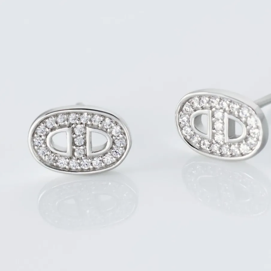 Boucles D’oreilles Puces Argent Blanc 925/1000 Maillon Pavage Oxydes De Zirconium