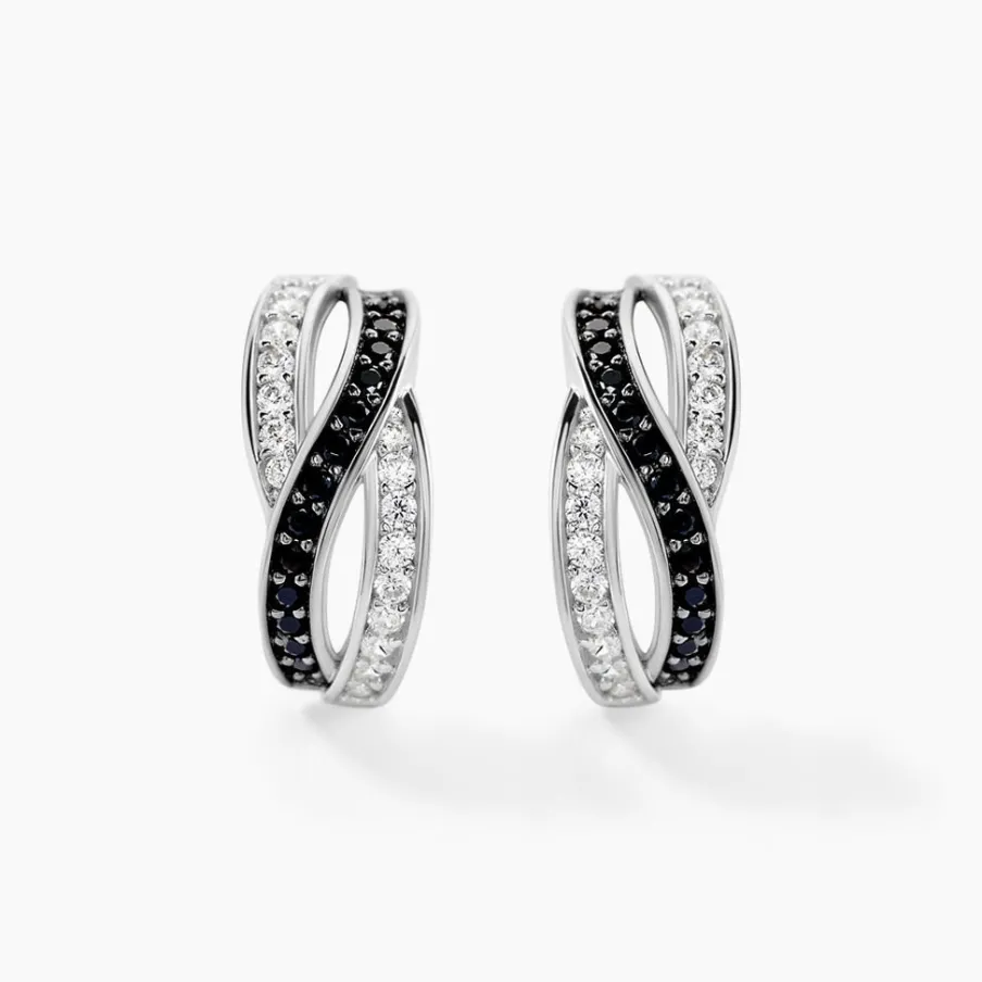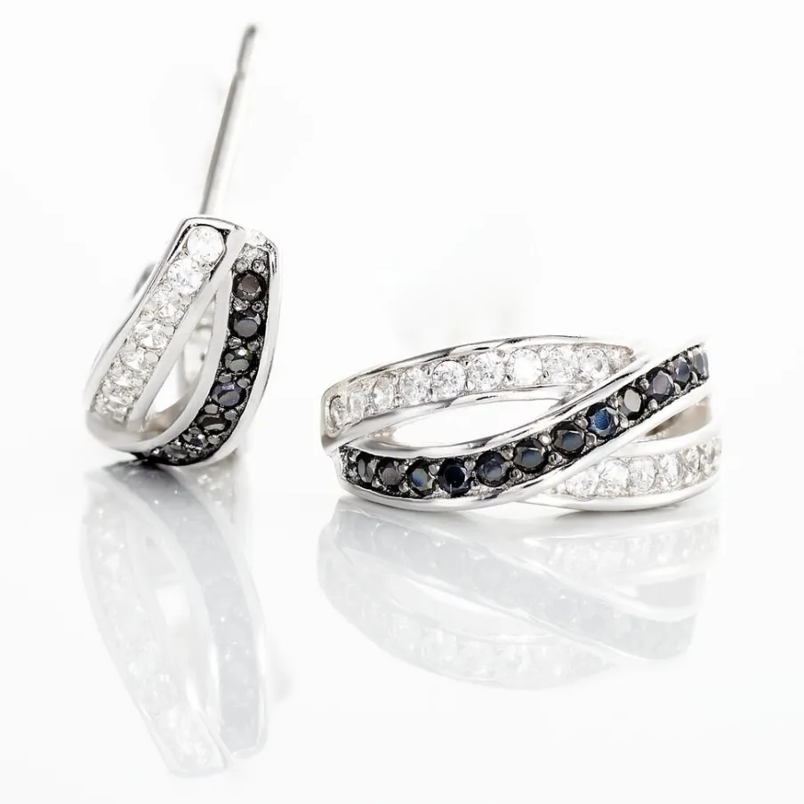 Boucles D’oreilles Argent Blanc 925/1000 3 Rangs Entrelaces Oxydes De Zirconium Blancs Et Noirs
