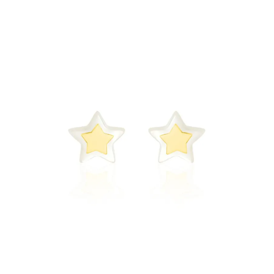 Boucles D’oreilles Or Jaune 375/1000 Puces Formes Etoiles + Motifs Etoiles Nacre Blanche