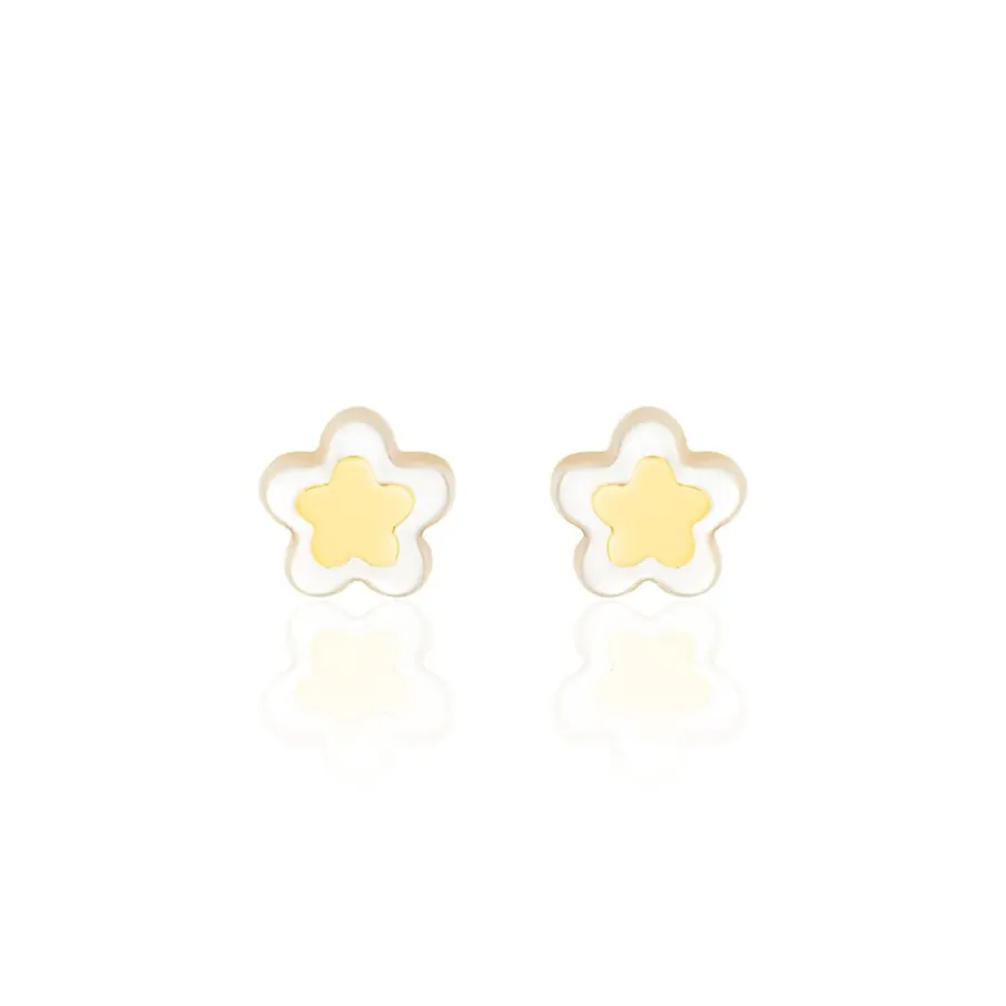 Boucles D’oreilles Or Jaune 375/1000 Puces Formes Fleurs + Motifs Fleurs Nacre Blanche