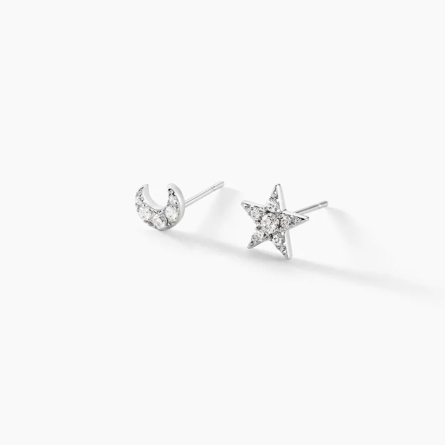 Boucles D’oreilles Or Blanc 375/1000 Puces Motifs Etoile Et Lune Pavages Oxydes De Zirconium