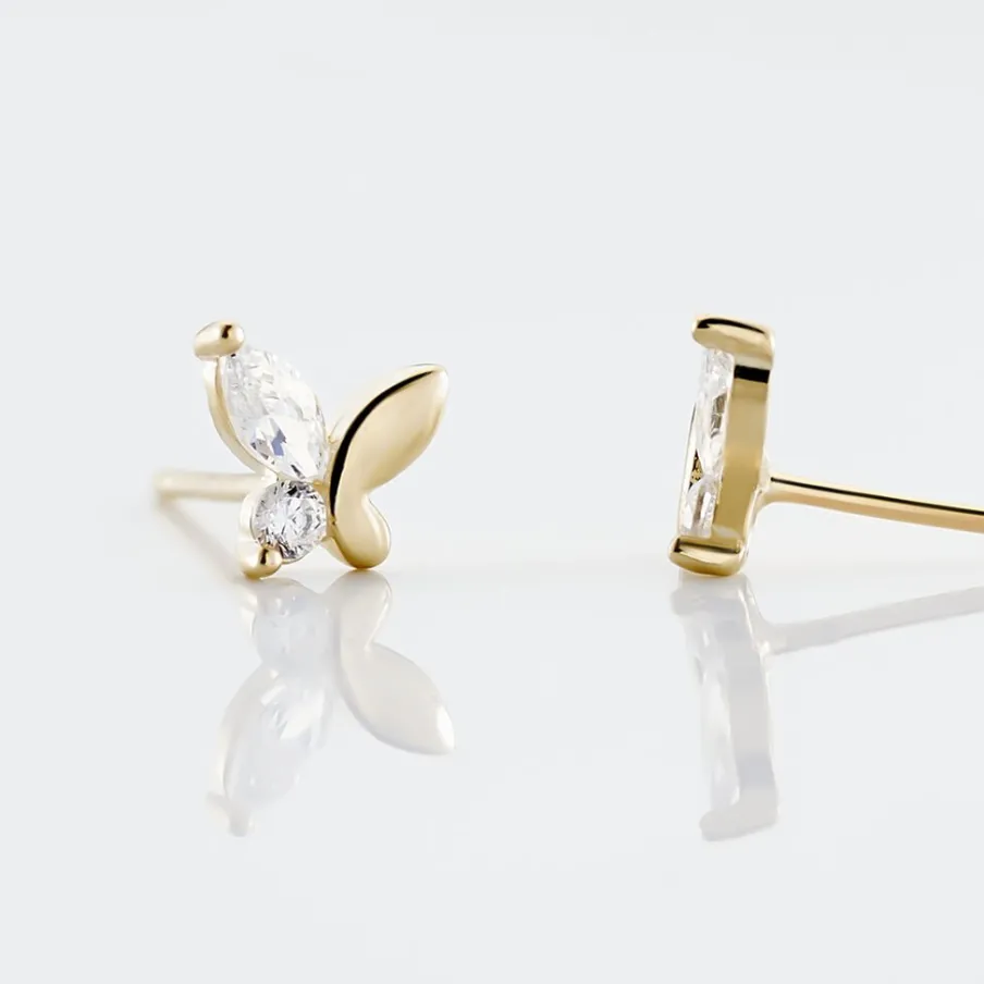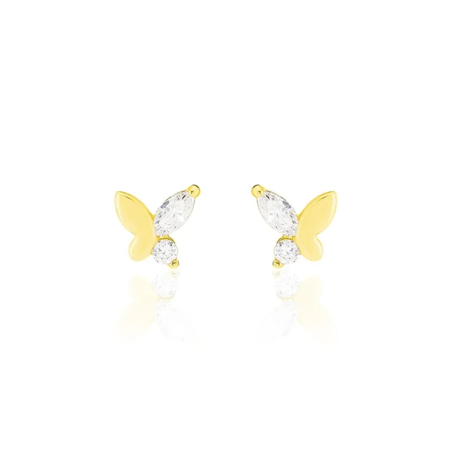 Boucles D’oreilles Or Jaune 375/1000 Puces Formes Papillons + Oxydes De Zirconium