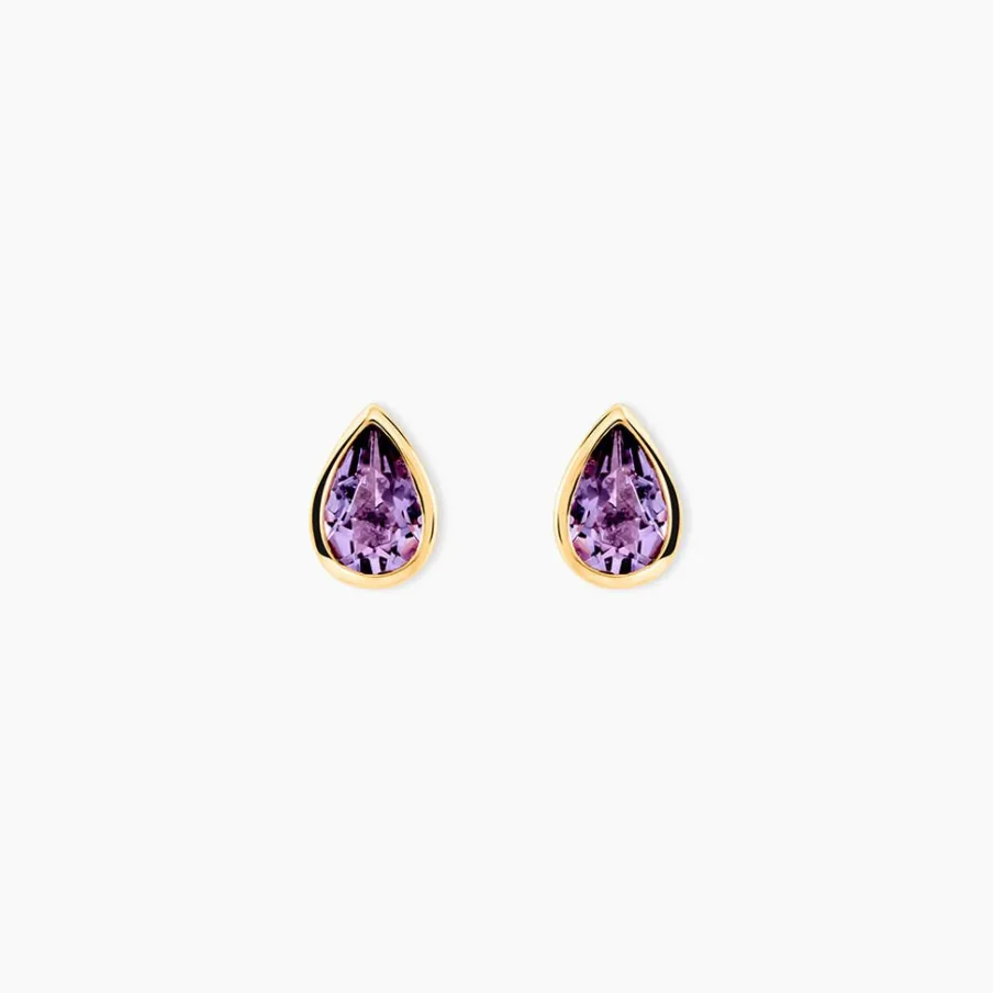 Boucles D’oreilles Puces Or Jaune 375/1000 Améthystes Serties Clos Formes Poires