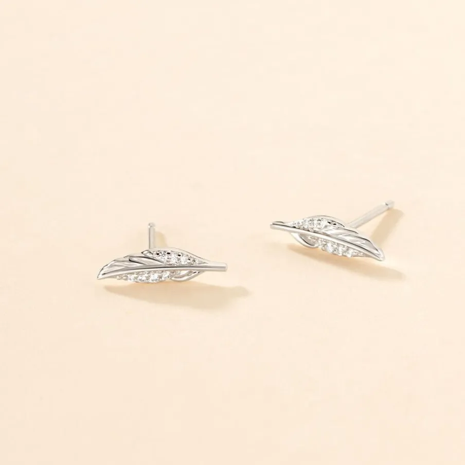 Boucles D’oreilles Puces Argent Blanc 925/1000 Plumes Pavage Oxydes De Zirconium