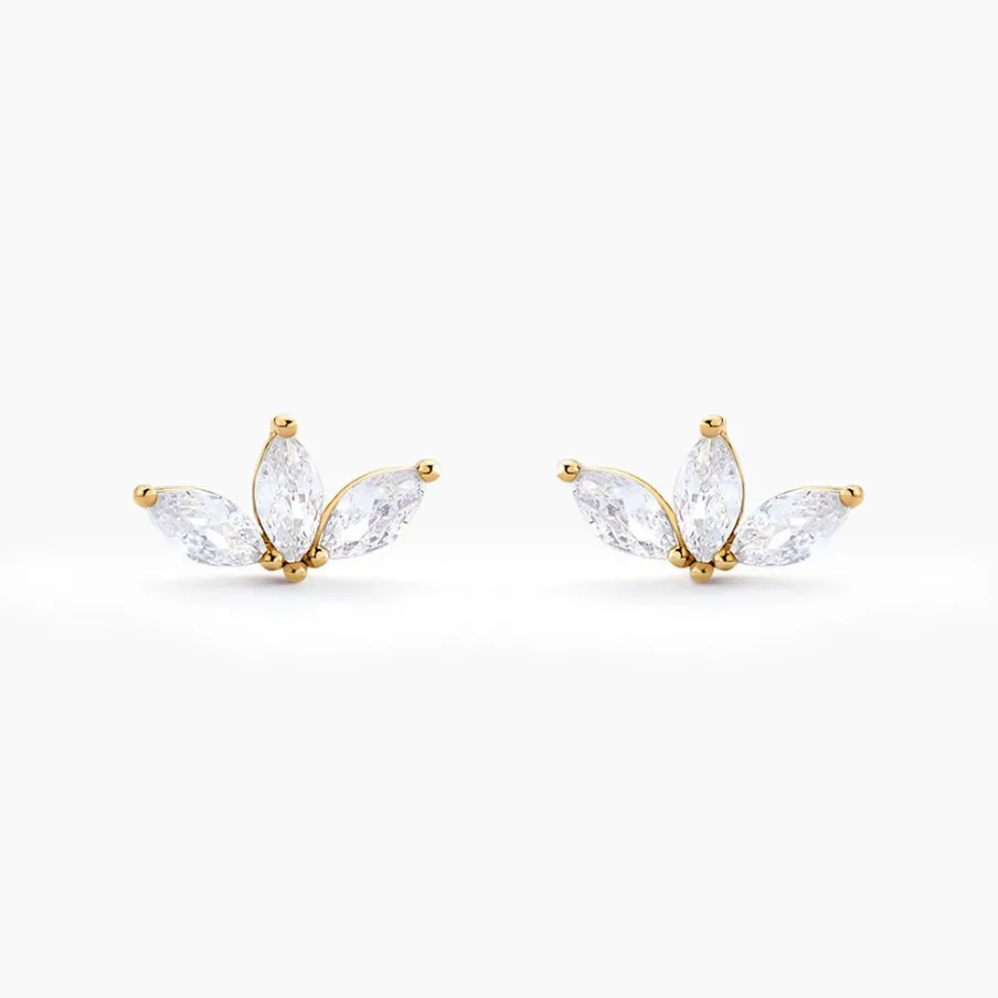Boucles D’oreilles Puces Or Jaune 375/1000 Fleur Oxyde De Zirconium Navettes Serti Griffes