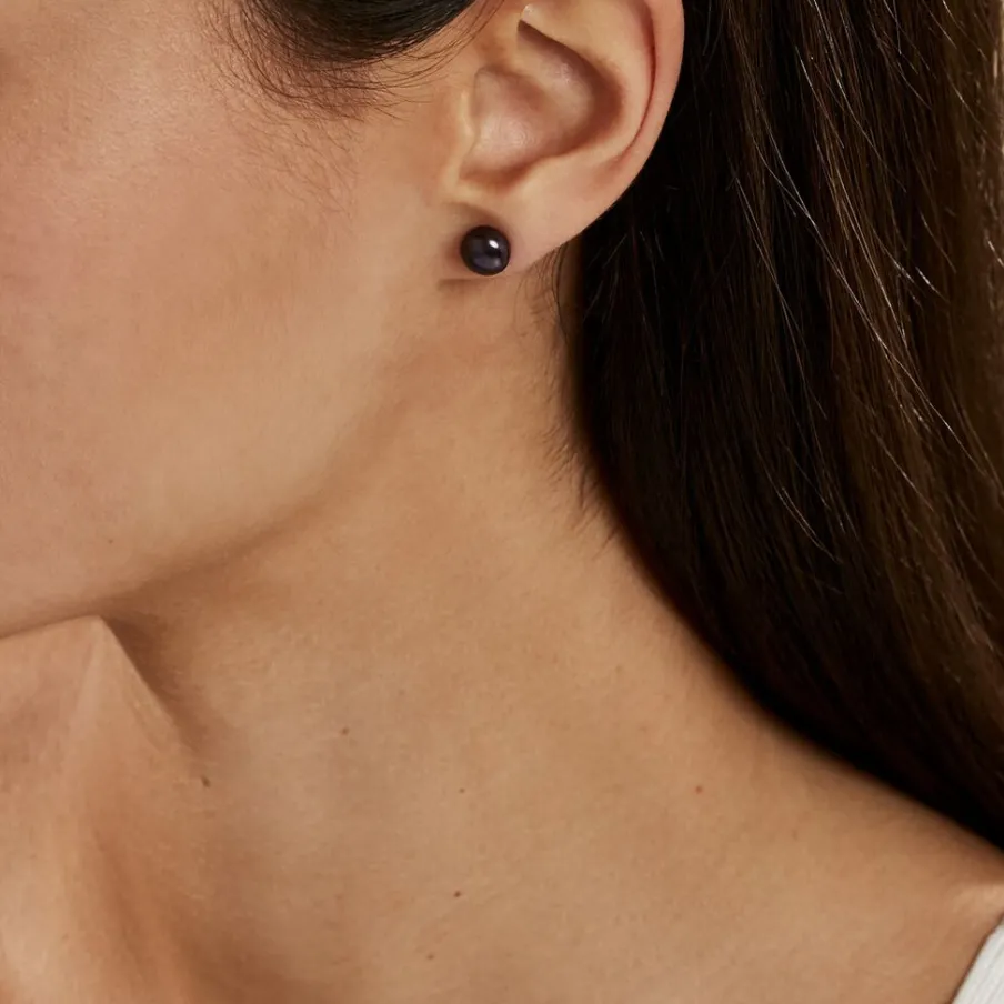 Boucles D’oreilles Or Jaune 375/1000 Perles De Culture Bouton Teintées Noires 8/8.5mm
